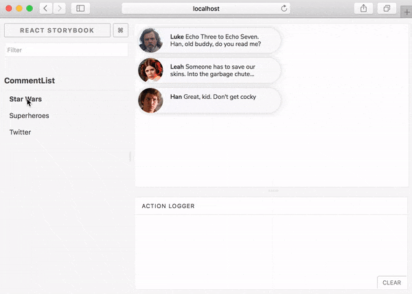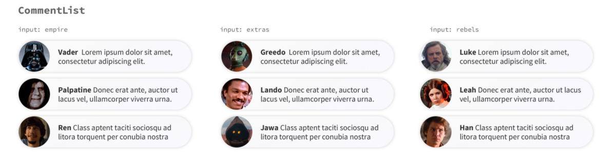 CommentList renders messages from various authors. Shown below are 3 permutations that rely on the same Star Wars data source. You might find a component like this confined to a galactic chat app. We want this component to be reusable in any app. Letβs make it so.