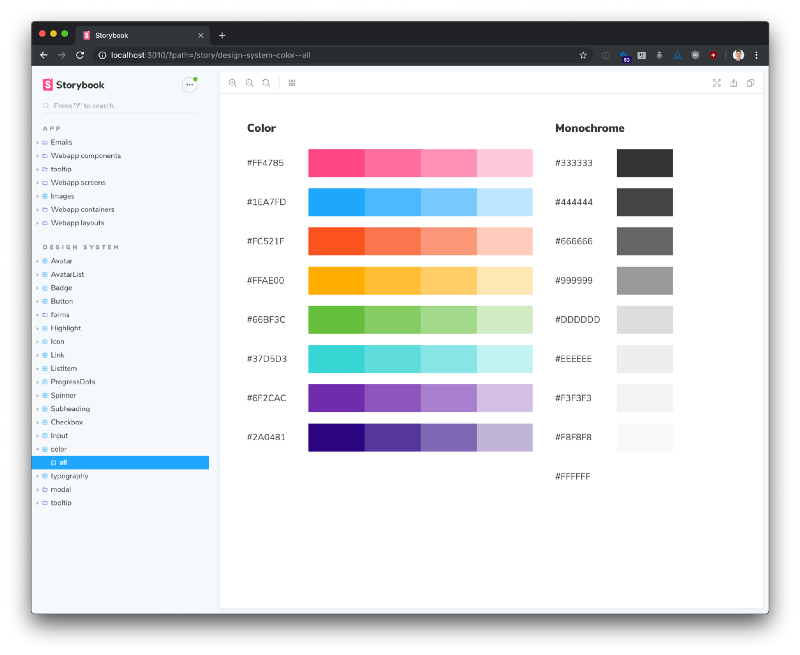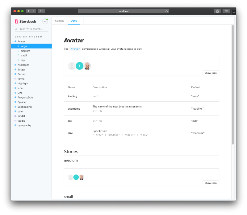 Every design system includes a reusable component library. We use Storybook for building components in isolation and cataloging the library. Storybook is supercharged with useful addons from the ecosystem.