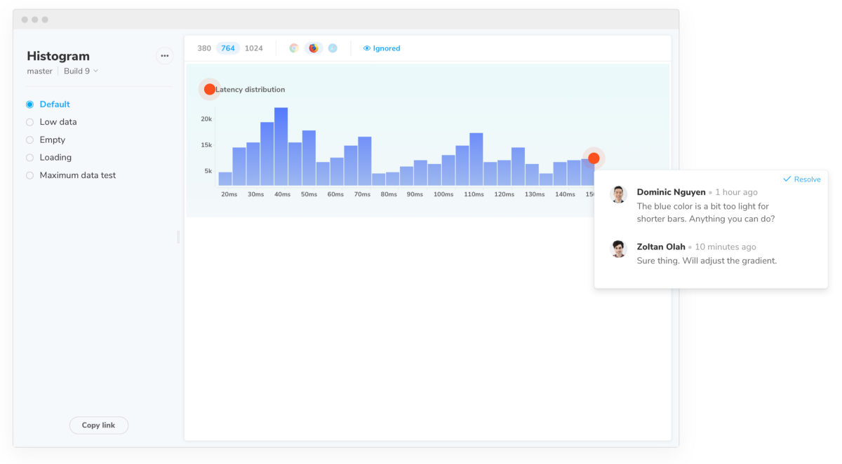 There are plenty of ways to communicate but none are made for UI development. Folks pollute Jira or Asana with minutiae. Abuse Slack channels. Paste screenshots and GIFs into pull requests. Or worse, reference the wrong outdated artifacts.