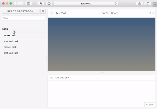 Many components take some callbacks that are provided by their parent and are expected to be triggered when an action happens on that component. Storybook has an interesting add-on which allows you to pass an “action” into the story and when the callback fires, a message is logged in the interface: