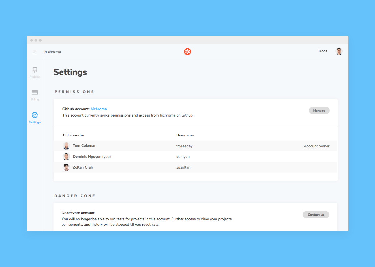 If you authorize your account or organization with GitHub, we’ll automatically sync permissions so you don’t have to re-share access in both places. Just keep GitHub up to date and Chromatic will give the right people access. (Bitbucket and GitLab coming soon)