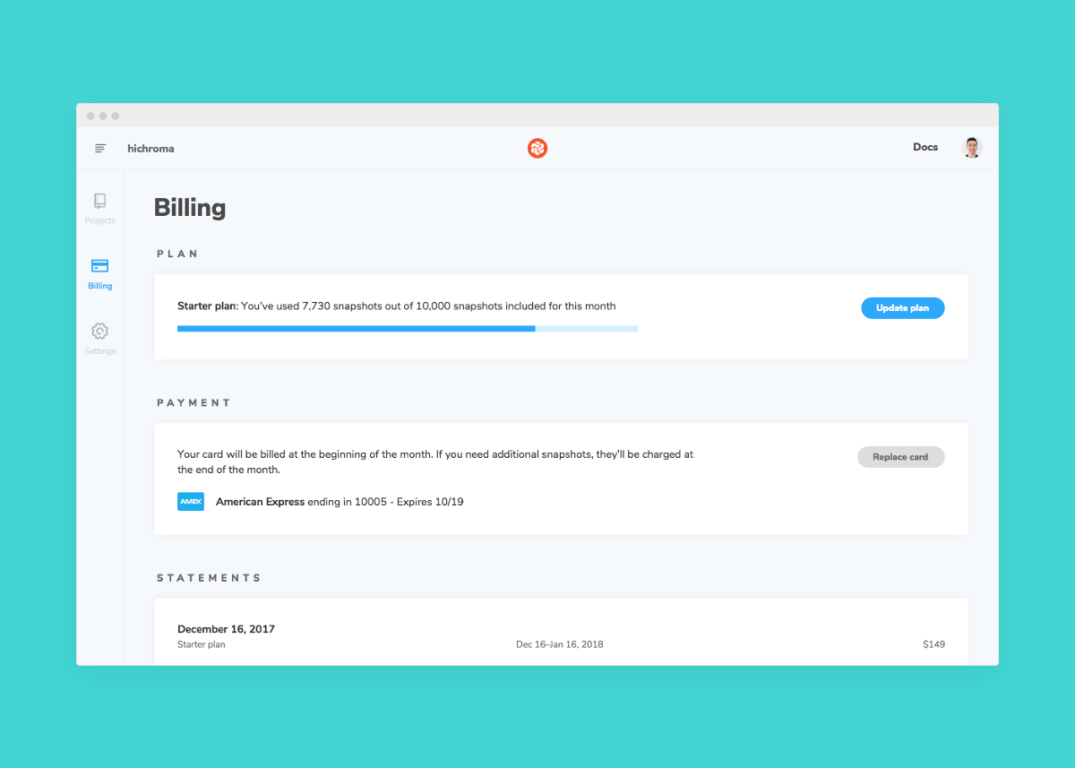 Chromatic’s goal is to help you ship consistent UIs, save time, and build bulletproof component libraries. The new billing area helps you see exactly what you’re paying for.