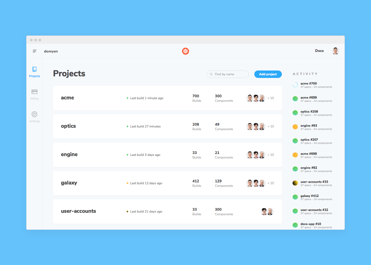 The Projects dashboard showcases projects from GitHub accounts you’re a member of in one place. Get an overview of components, builds, collaborators, and track the latest activity in a glance.