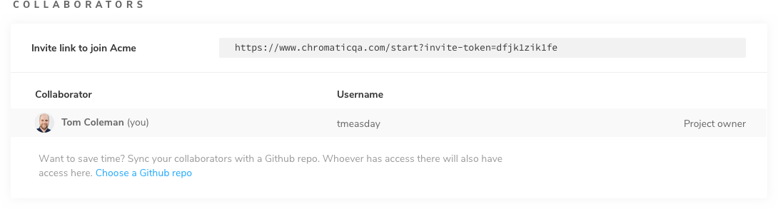Want to share access to your Chromatic projects and don’t use GitHub? Just copy and paste an invite link from your project’s “manage” tab.