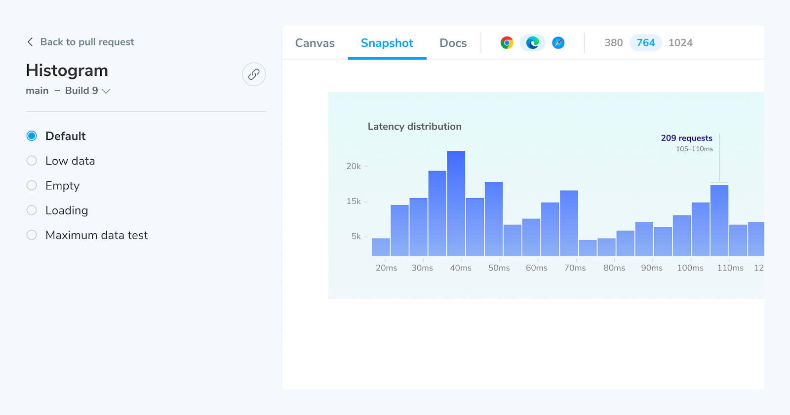 Your team can also see how a story renders in a given browser across different builds and branches on the component screen.
