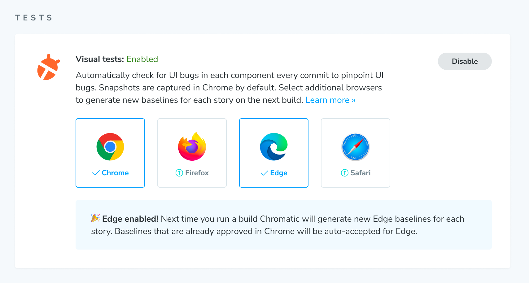 Chromatic extends test coverage across browsers in one click. Note: You must be on a Standard or Pro plan to enable Safari and Edge.