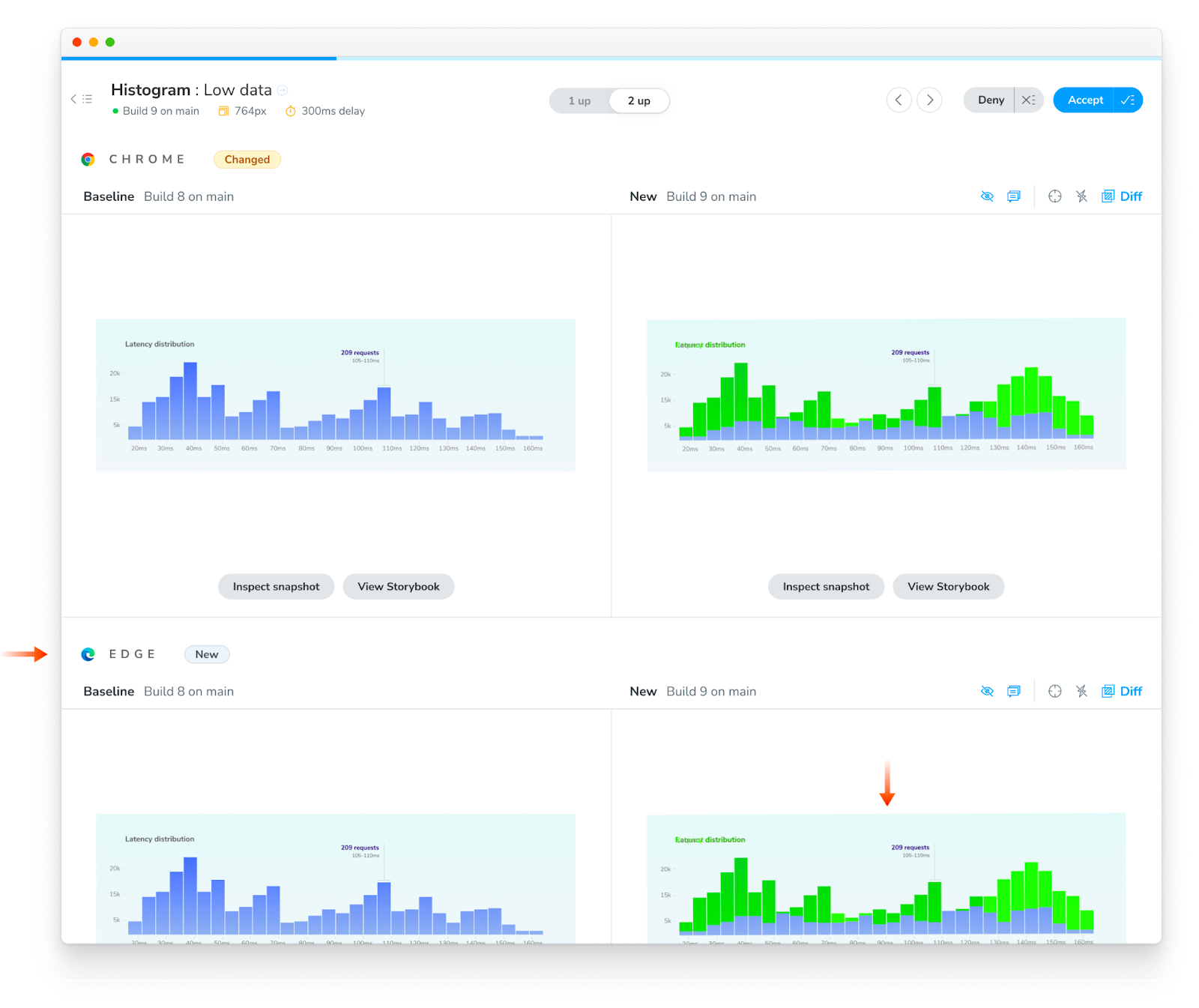 On the next test build, Chromatic will create baselines for the newly enabled browser. Previously accepted stories in Chrome will be auto-accepted as baselines in the new browser.