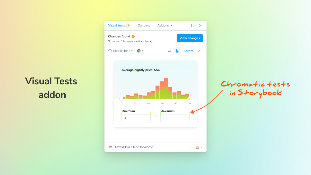 The Visual Tests addon brings the power of Chromatic right into Storybook, so you can run visual tests without waiting on CI.