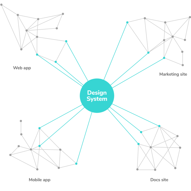 A design system scales this model to an organization. It enables sharing common components between apps by centralizing them in one place. Since design systems are really just another dependency, when system components change so do the dependent apps.